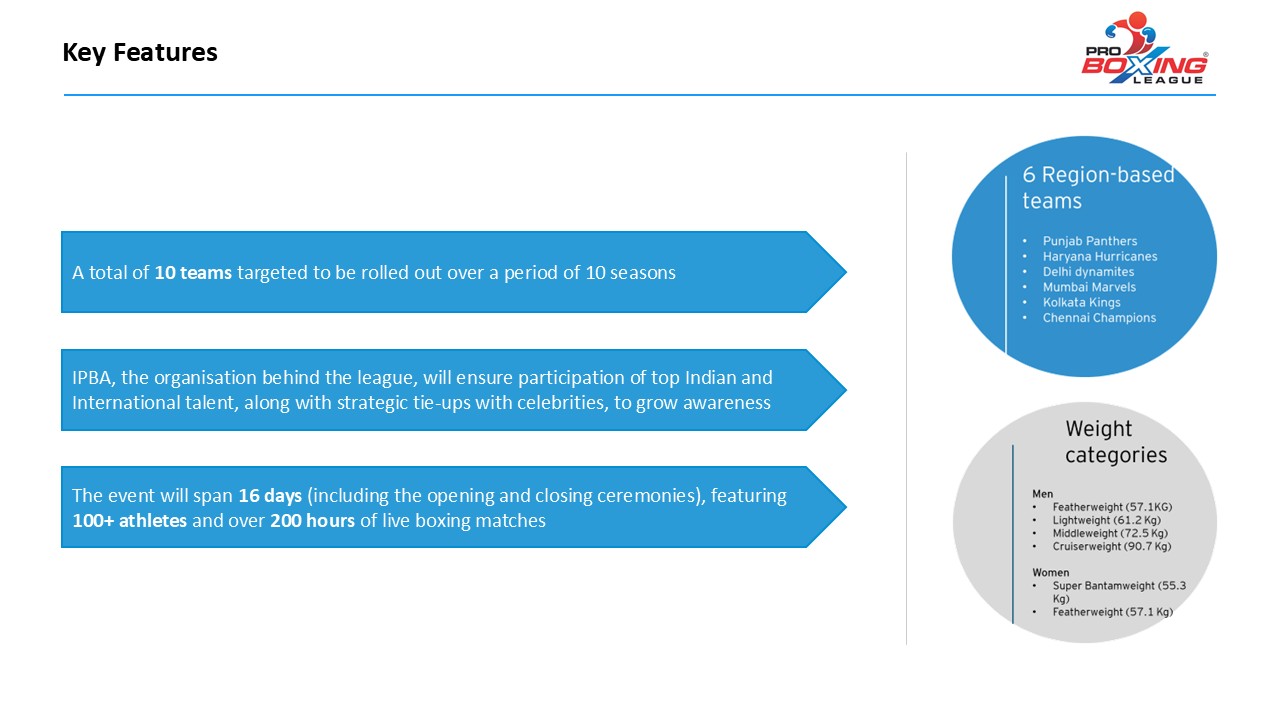 The Indian Pro Boxing League will be organized by the Indian Professional Boxing Association (IPBA) in collaboration with major boxing organizations (WBA, WBO, WBC, and IBF) along with sponsors and global stakeholders.